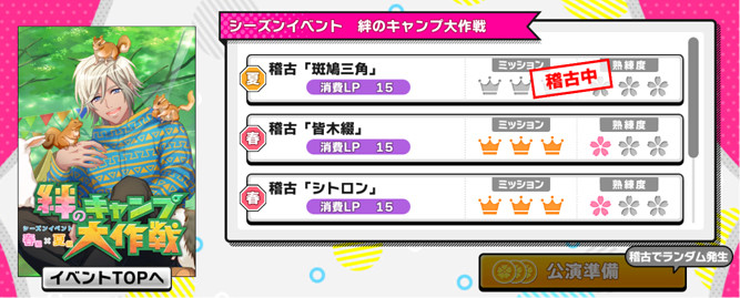 稽古もプレイできなくなるのでミッションや熟練度上げでの報酬ダイヤやストーリー回収を忘れないようにしましょう。スクロールで気づきにくいですが春夏あわせて5種類の稽古がありますのでイベント期間内に全部クリアしましょう。