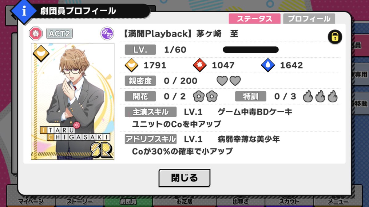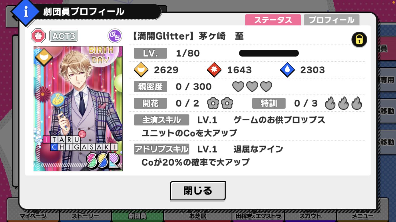 SSR 【満開Glitter】茅ヶ崎至 Co主演スキル「ゲームのお供プロップス」