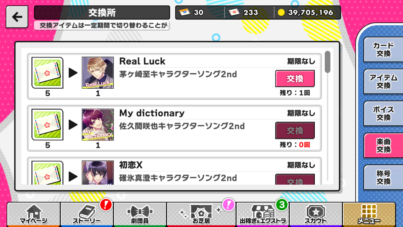 また交換所に新キャラクターソング「Real Luck」が追加されました。