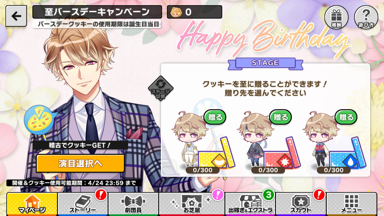 ・クッキーを贈るとクッキー1つごとに至さんの全カードの対応ステータスが1アップ(04/30 23:59まで)