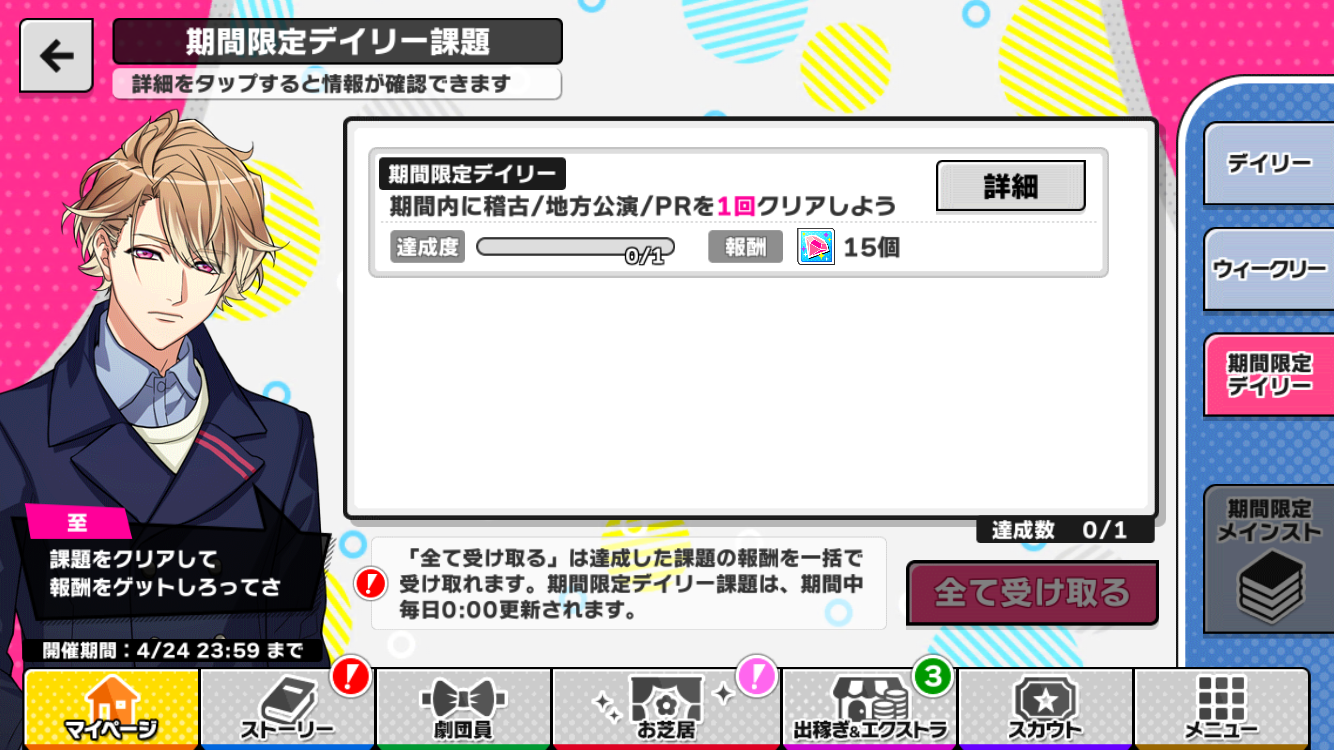 本日限定誕生日の特別課題があります。期間限定デイリー課題 『稽古を1回クリアしよう』 報酬:ダイヤ15個