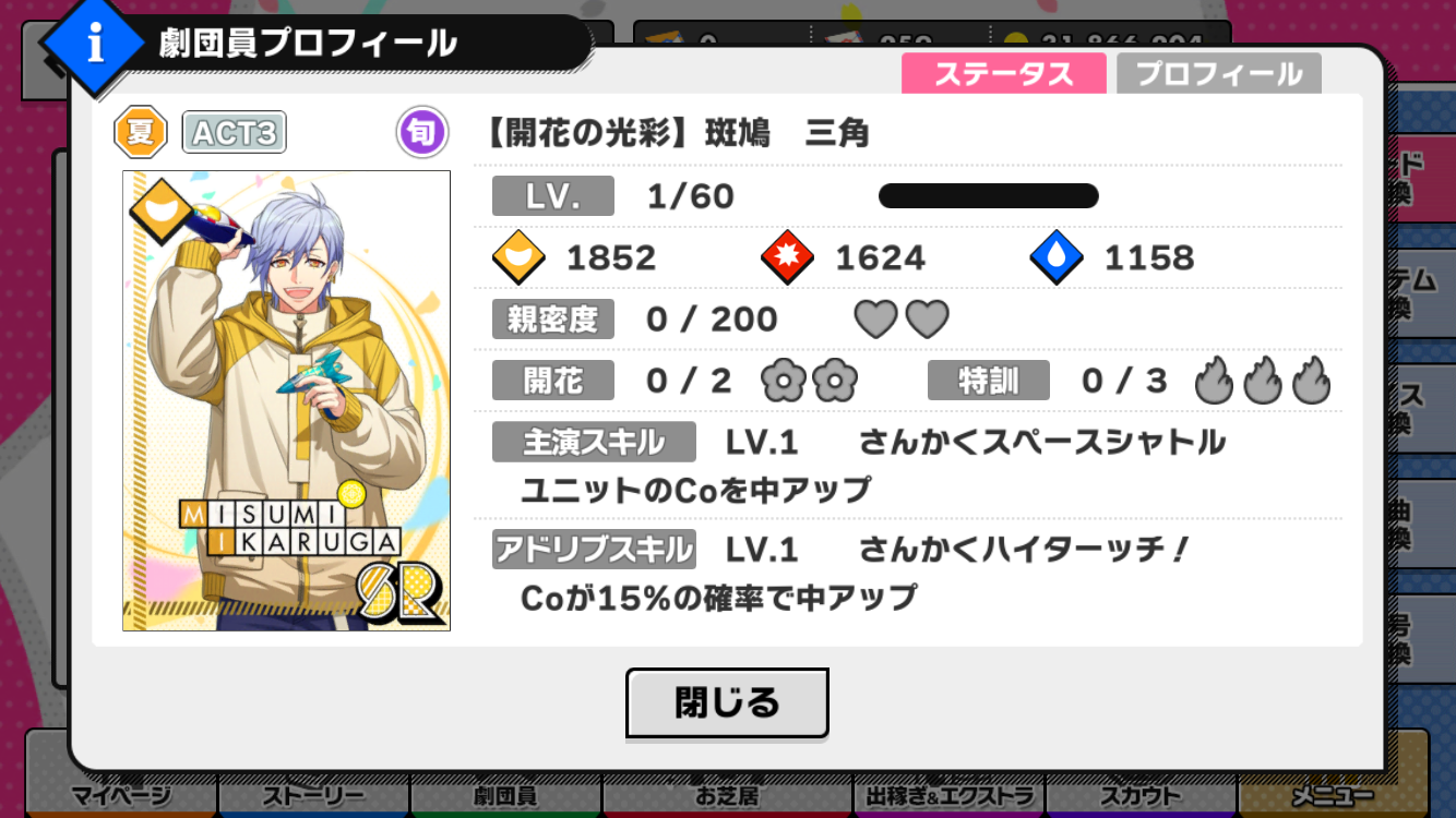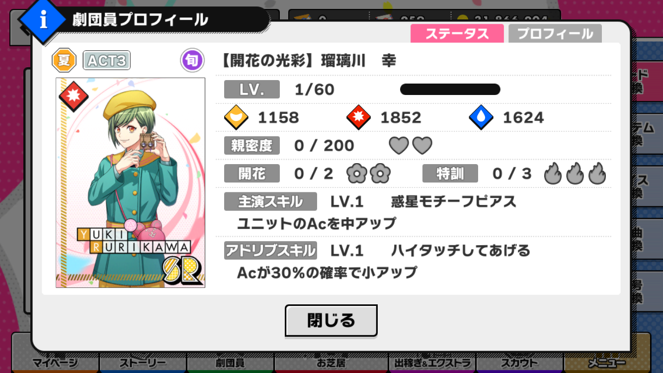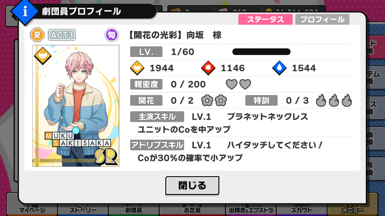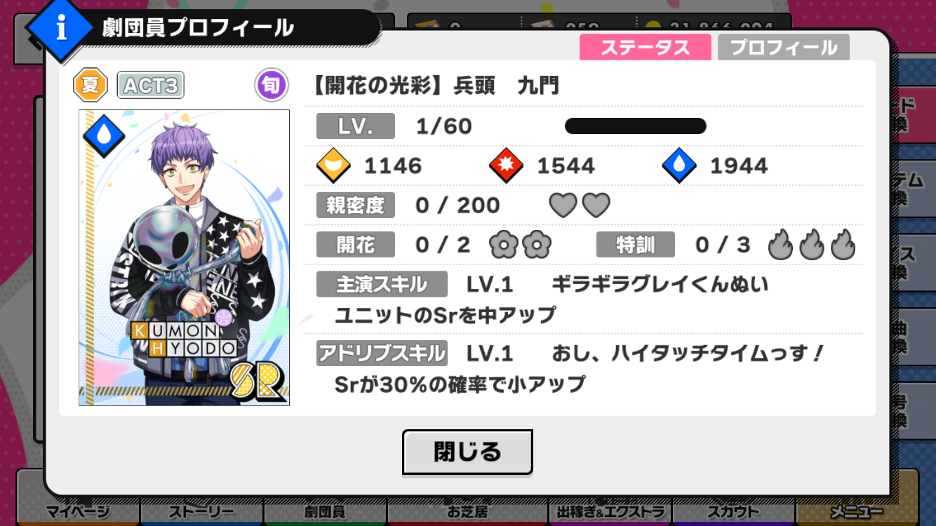 夏組のSR【開花の予感】は排出されません。春秋冬のSR【開花の予感】は排出されます。