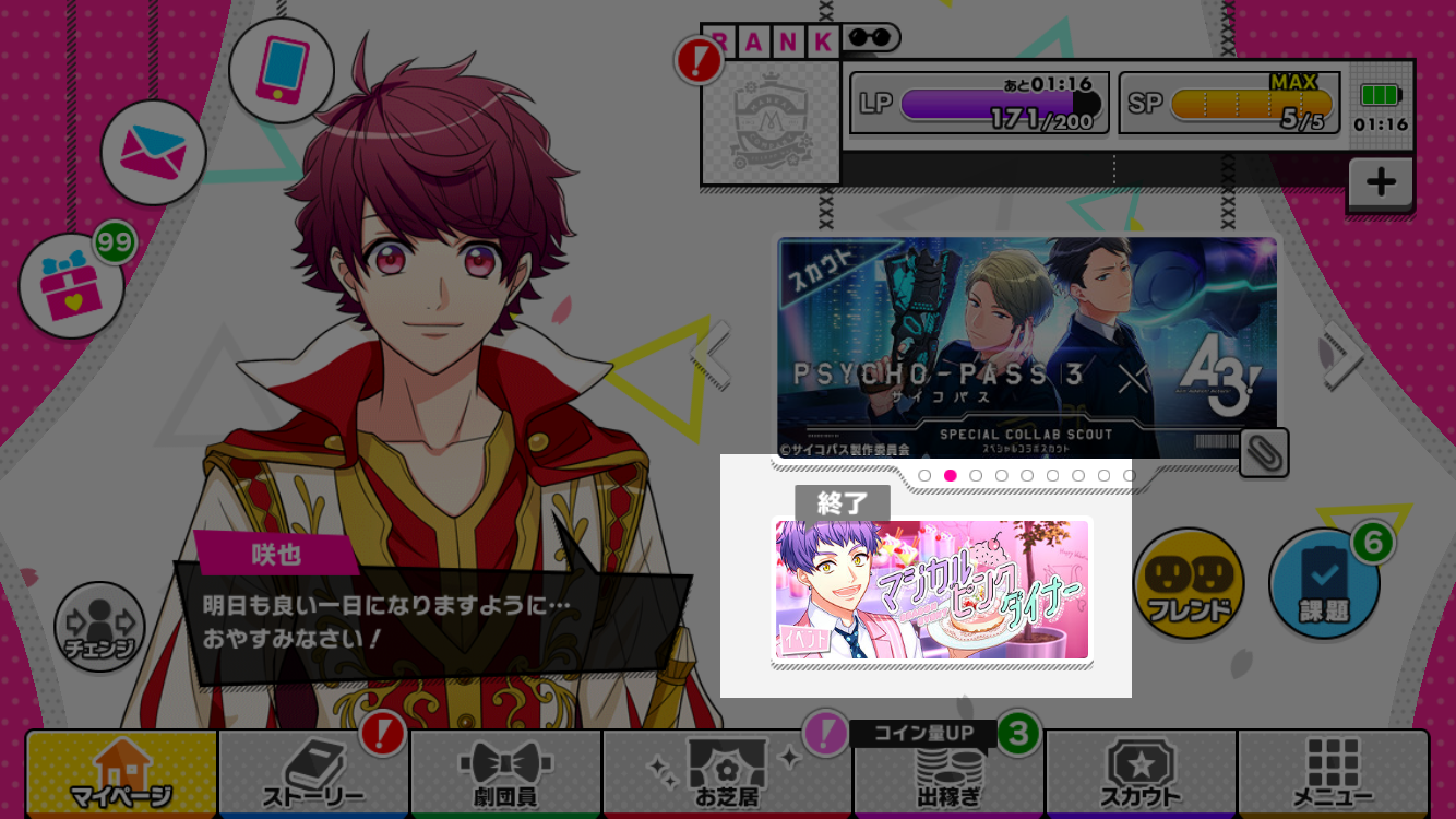 ホーム画面の新人課題バナーが消え、イベントバナー(前回のコラボイベントの画面です)が表示されれば準備完了です。