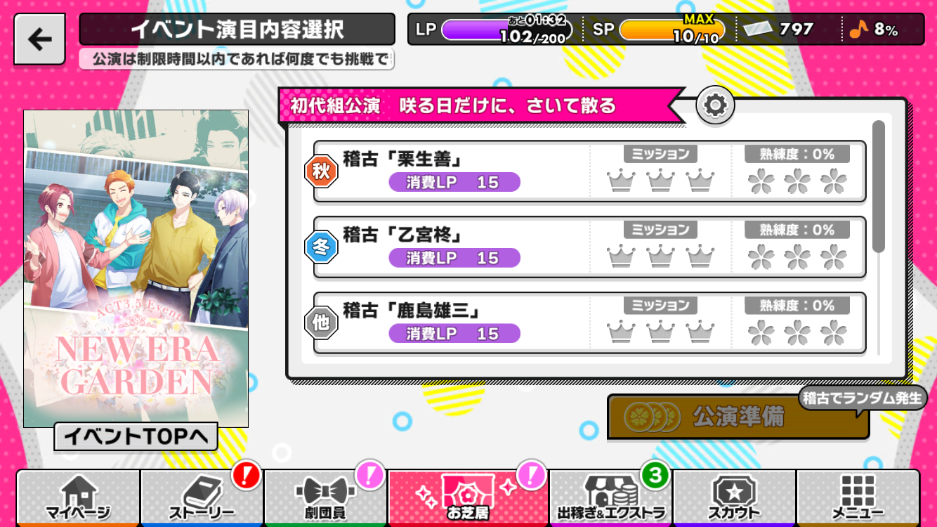 ①春夏秋冬劇団員カードフレンドスカウトや稽古クリアなどで入手が可能です。