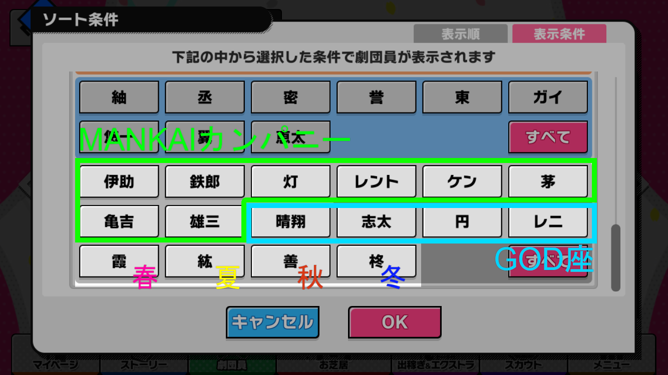 その他キャラでもMANKAIカンパニーのキャラとGOD座のキャラは区別されており、今回雄三コースではMANKAIキャラ、レニコースではGOD座キャラが出現しないとテンションが上がりません。