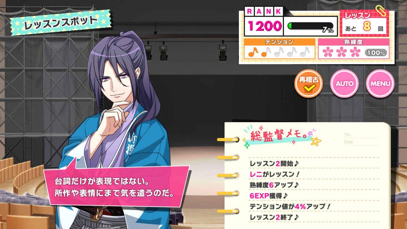 元々出現する稽古のキャラが必ずいて、6分の1の確率で出現した際にテンションや熟練度が上がります。