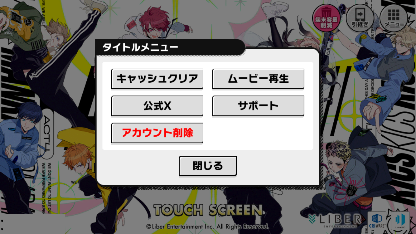 タイトルに戻り、タイトル画面右上からメニューを開くとアカウント削除をすることができます。