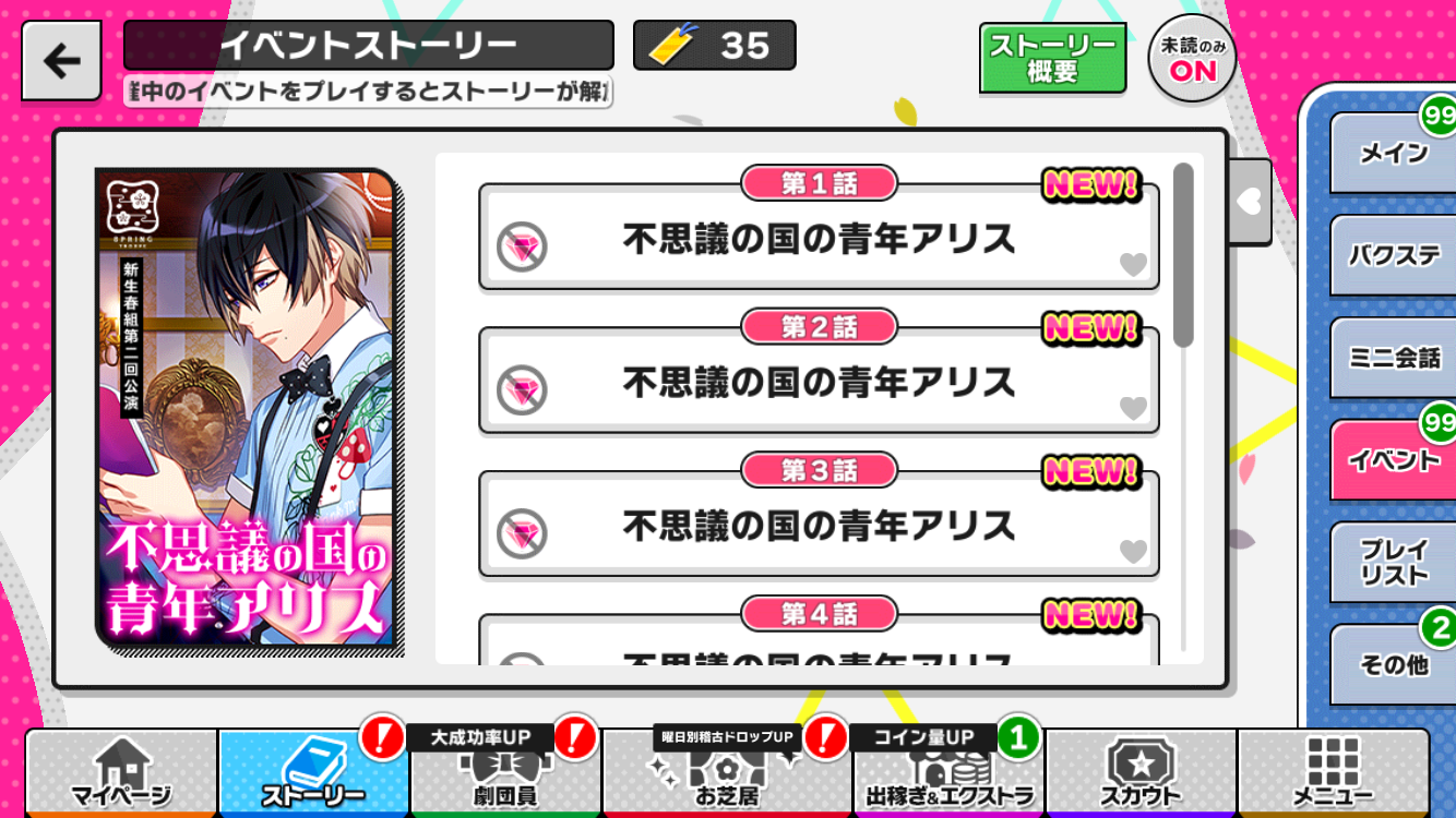 イベントストーリーも一部条件なしで読めますが、こちらはダイヤがもらえませんので、ダイヤが欲しい場合は必ずメインストーリーを読みましょう。