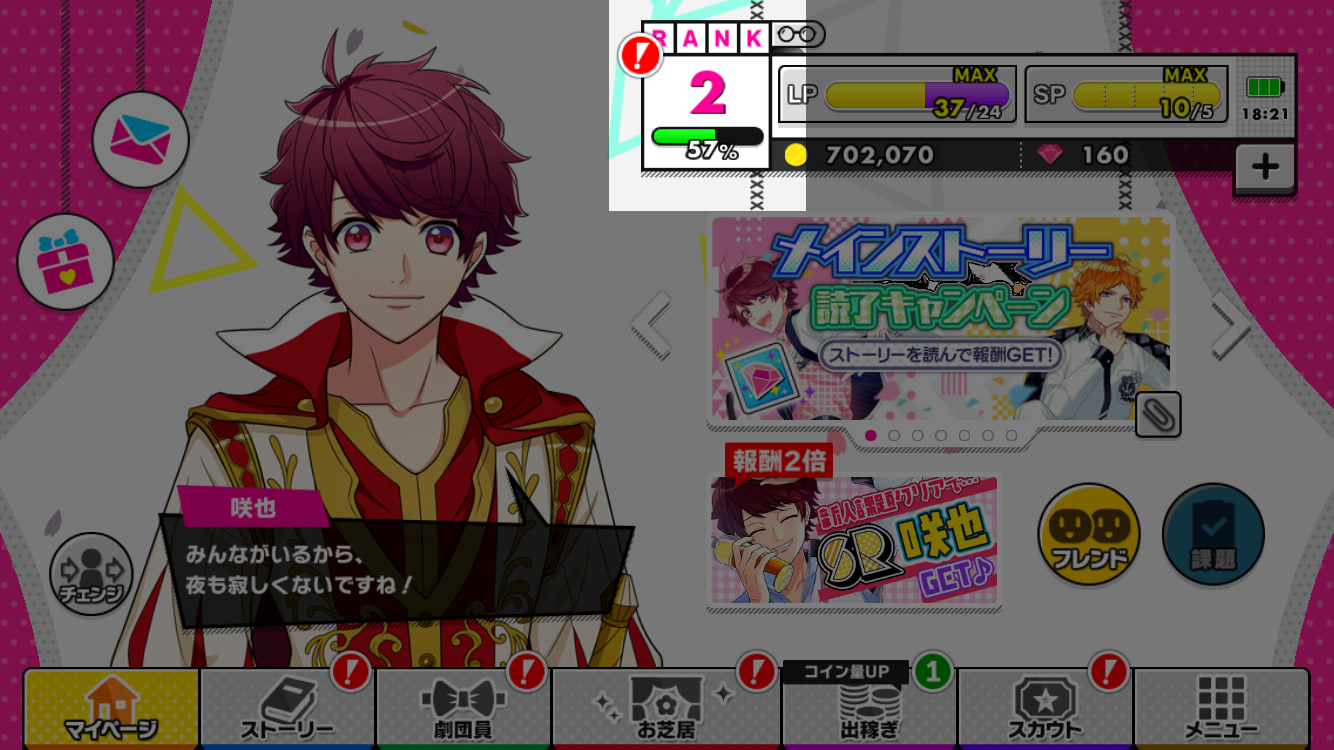 稽古をするとユーザーRANKがあがり、メイン演目の公演が増えたり、読めるメインストーリーが増えたりします。また、LPの最大値が上がります。
