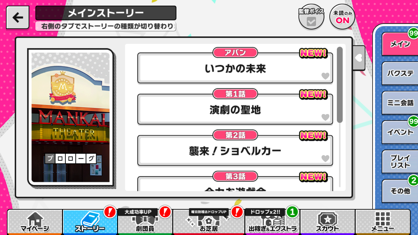 全部読むのは大変そうという方はスキップでもOKですが、A3!のメインストーリーはフルボイスでオート機能があるので、ムービーやボイスドラマ感覚でストーリーを見たり聞いたりするのもおすすめですよ!