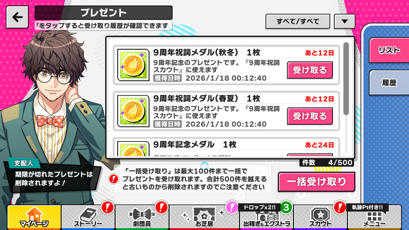 また9周年記念祝詞スカウトメダル春夏/秋冬がそれぞれ1枚配られていると思います。